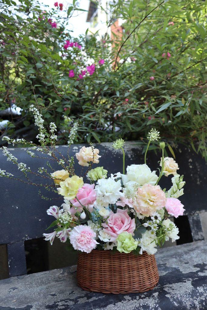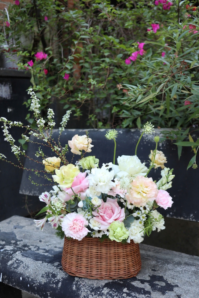 Hoa Nguyên Liệu: Giỏ hoa tông hồng pastel