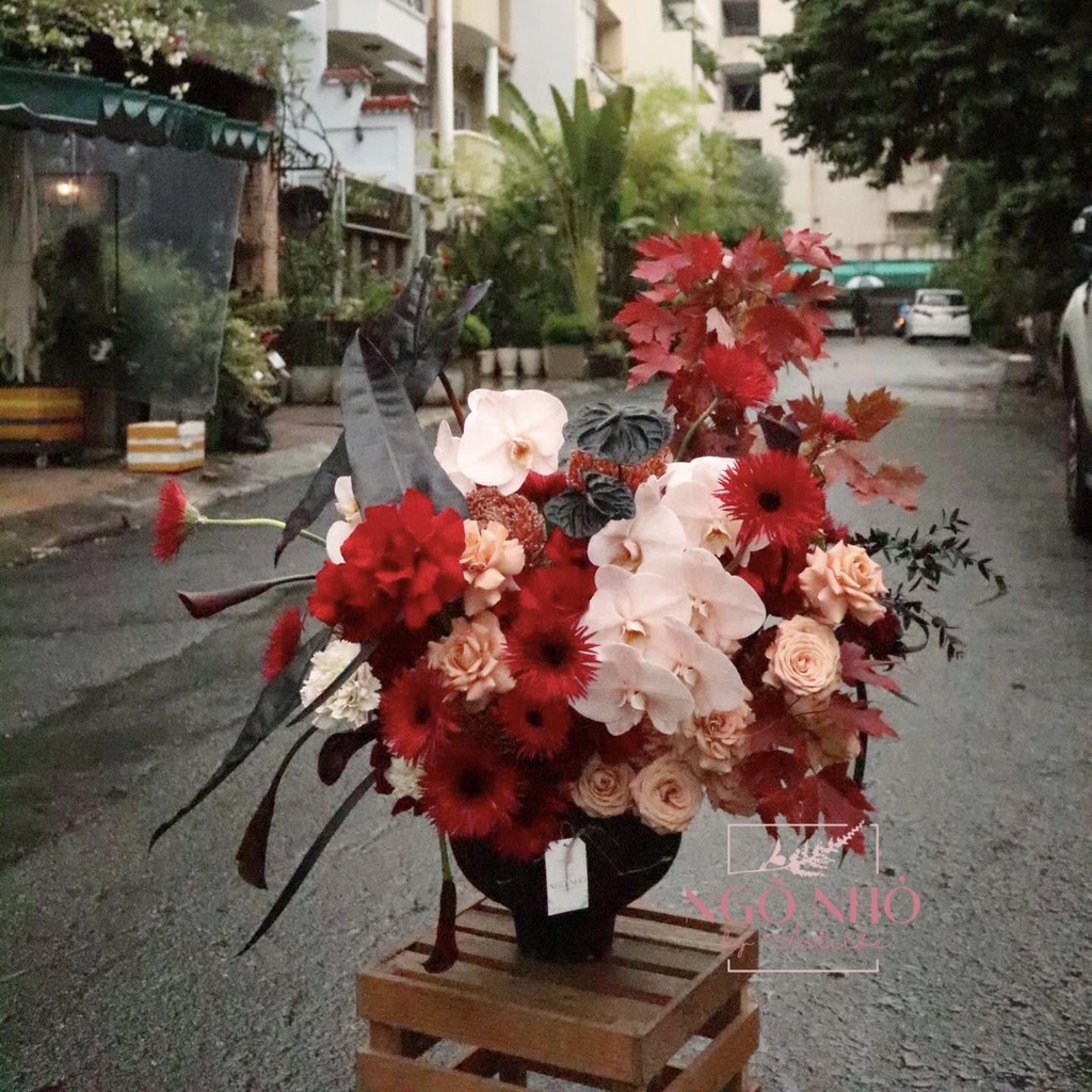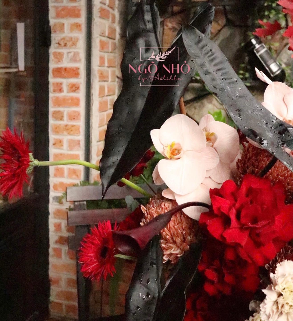 Hoa Nguyên Liệu: lan hồ điệp nâu, hồng Ecuador, hồng capu, callalily đen, cúc mẫu đơn nâu (Malaysia), lá phong, hồng môn, lá hạc cam, đồng tiền tua,....