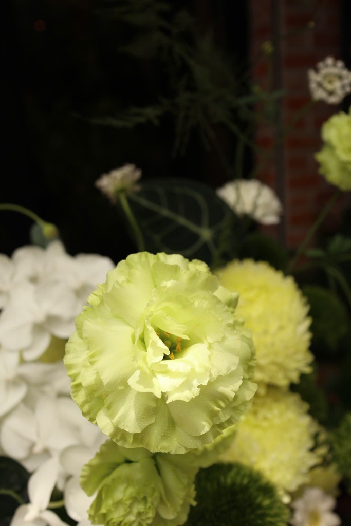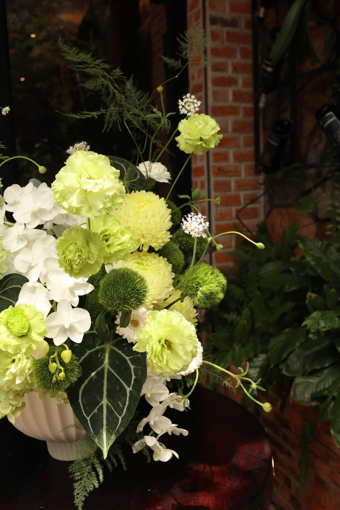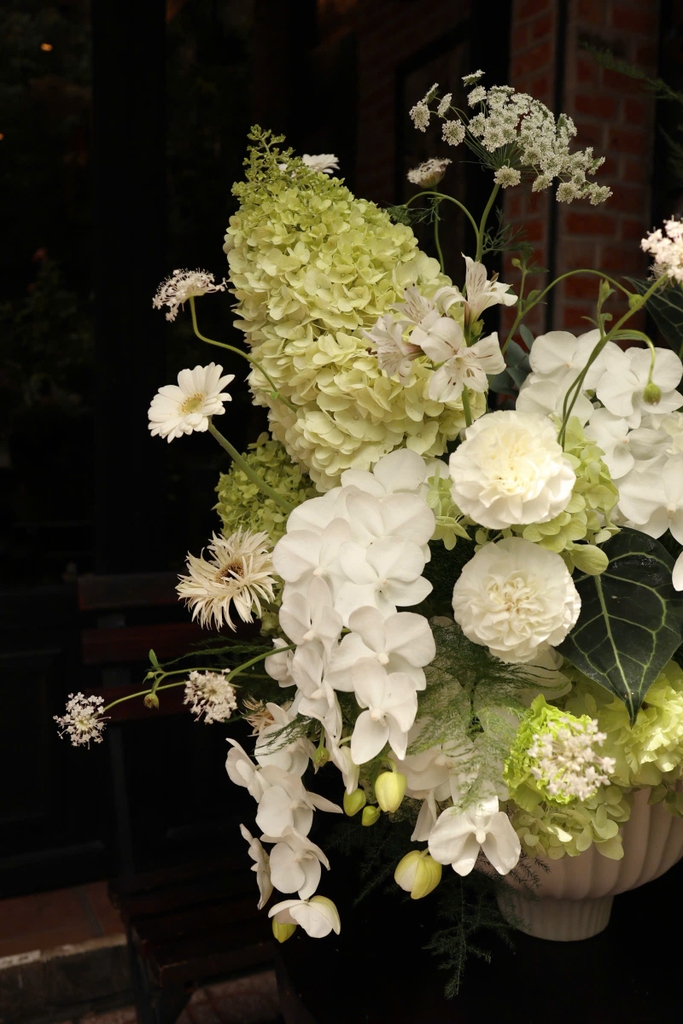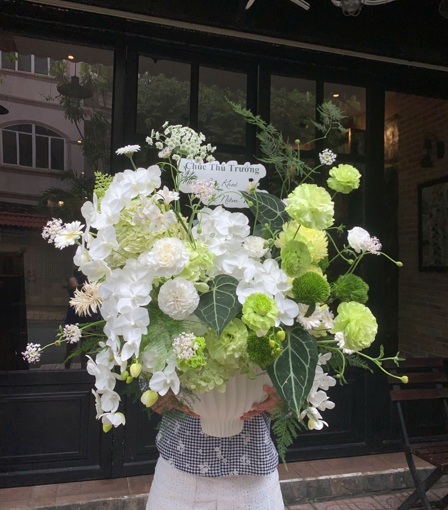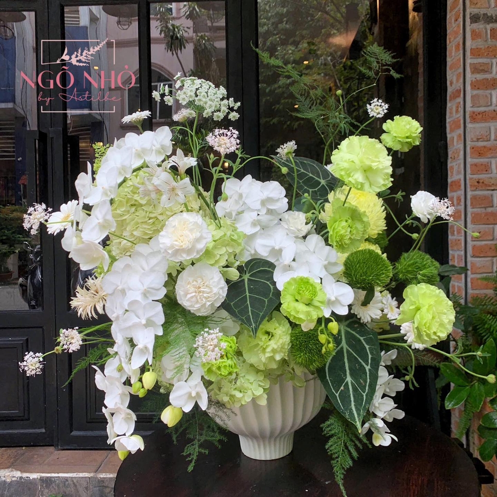 Hoa Nguyên Liệu: Tú Cầu Tháp (NK), Cát Tường, Lan Hồ Điệp, Cẩm Chướng, Green Wicky, Lá Trái Tim, Đồng Tiền, Thúy Châu, Ren Nữ Hoàng,....