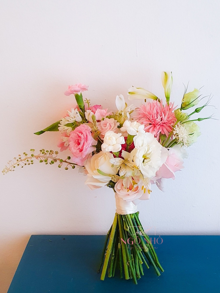 Bó hoa cưới tone hồng trắng gồm hoa cát tường, hoa hồng sâm, hoa hồng trắng, hoa hồng cồ, hoa thủy tiên, hoa thúy châu và cẩm chùm, thiết kế thanh nhã và ý nghĩa.