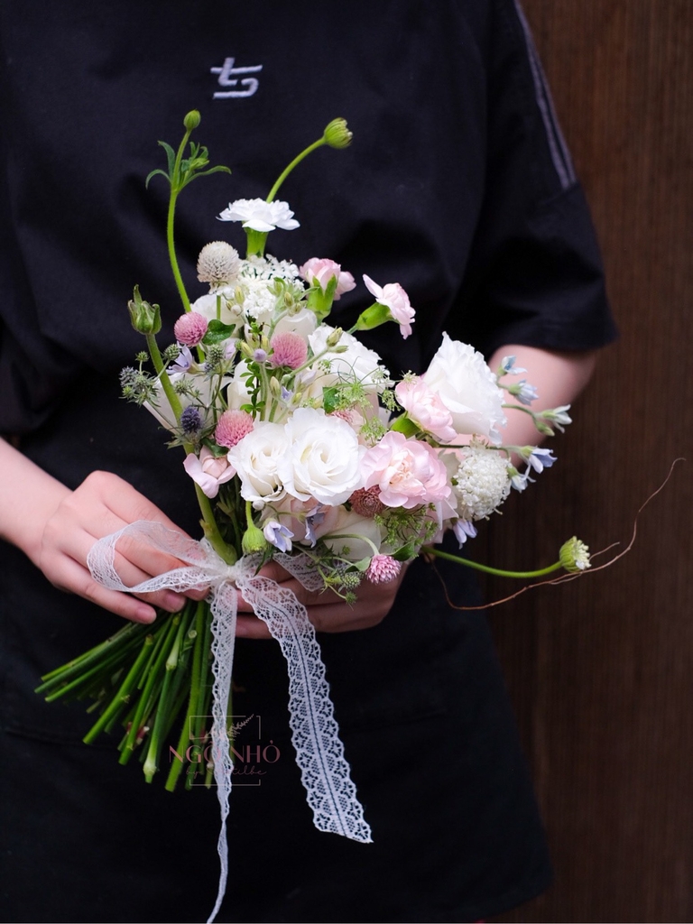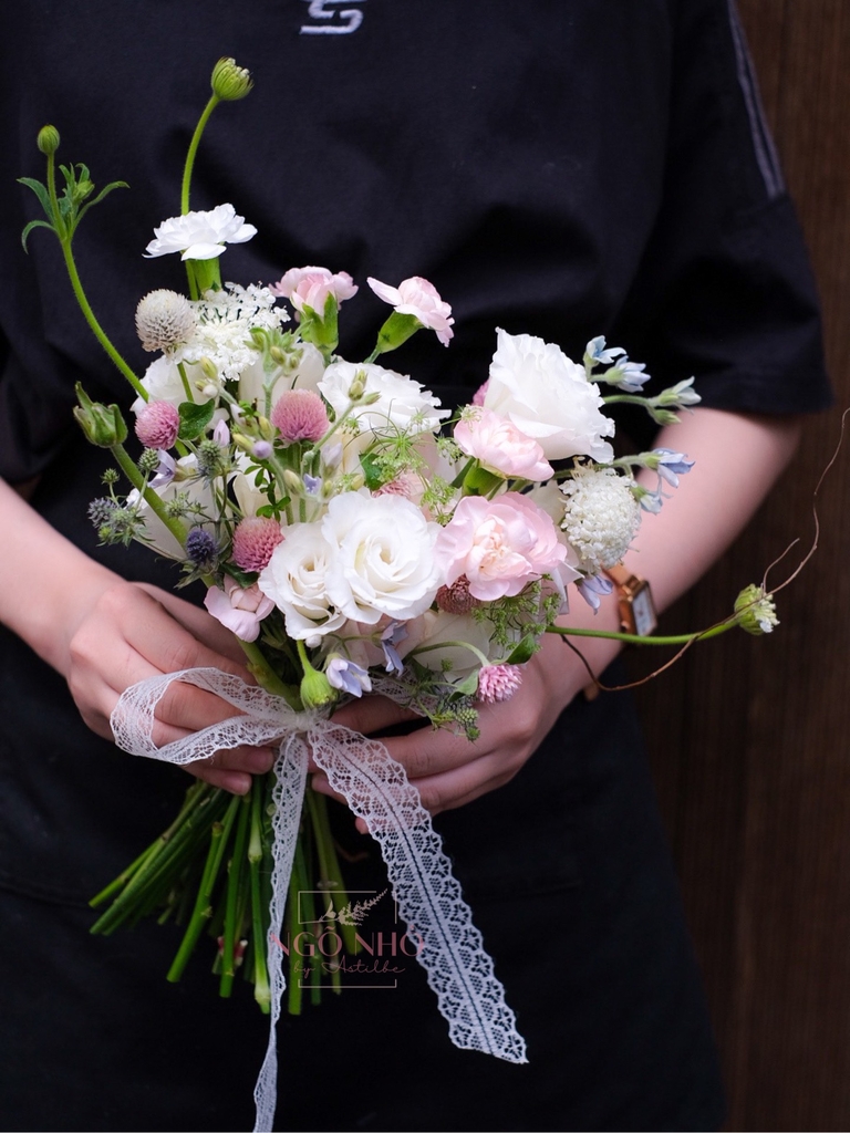 Bó hoa gồm các loại hoa nhỏ nhắn như cát tường, cẩm chùm, cúc mini và các loại hoa nhỏ khác, mang đến vẻ đẹp dịu dàng và tinh khôi. Sự phối hợp với sao xanh nhập khẩu, thúy châu và salix tạo nên sự bổ sung và điểm nhấn cho tổng thể hoàn thiện của bó hoa.