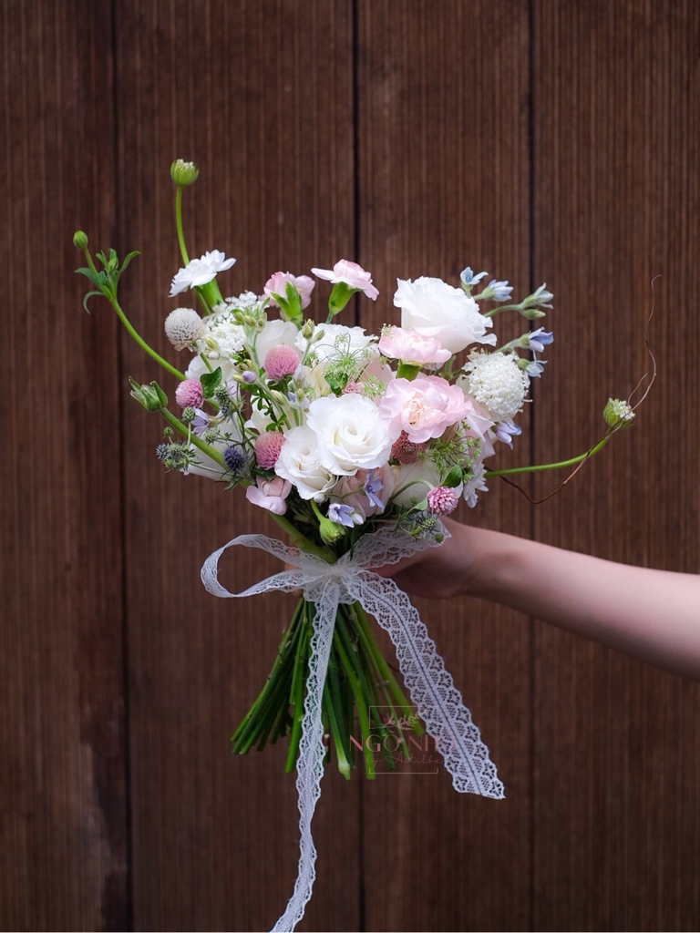 Mô tả tóm tắt: Bó hoa cưới tone hồng trắng nhỏ nhắn, phù hợp với cô dâu nhỏ nhắn, gồm cát tường, cẩm chùm, cúc mini, sao xanh nhập khẩu, thúy châu, salix, hoa hồng cồ và trắng.