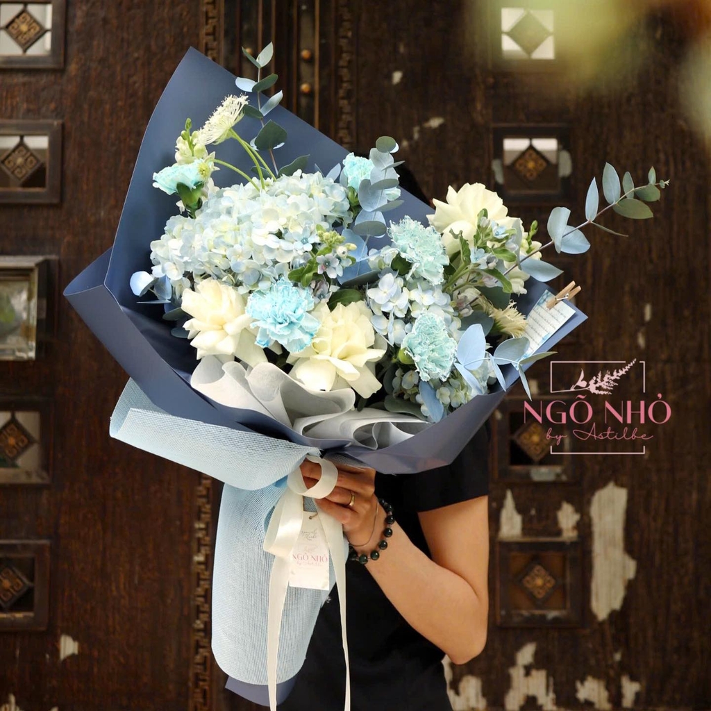 Hoa Nguyên Liệu: cẩm tú cầu, cẩm chướng, sao xanh, thúy châu, hoa hồng trắng,...