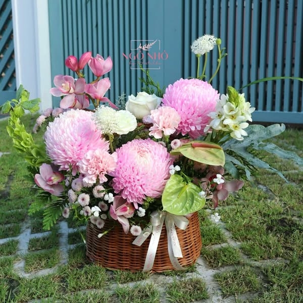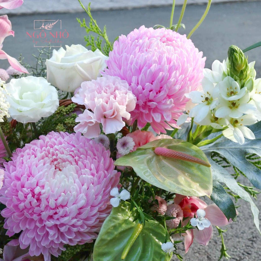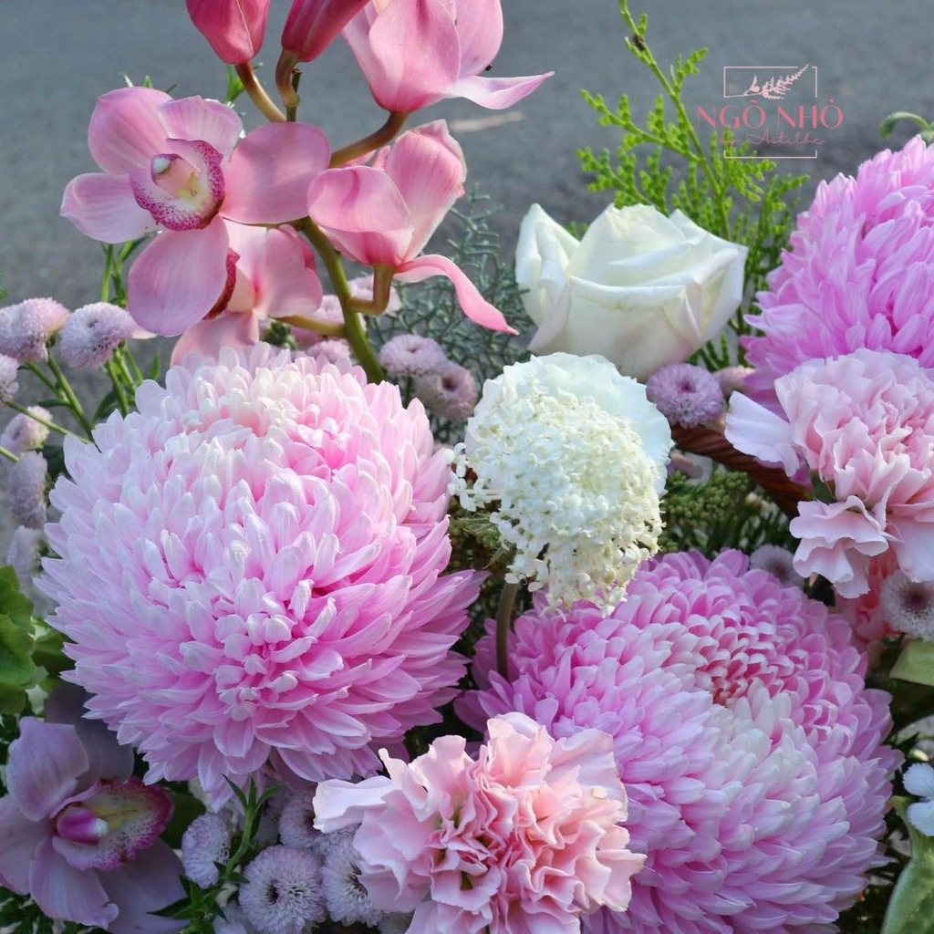Hoa Nguyên Liệu: cúc mẫu đơn (Malaysia), Thiên Nga (Hà Lan), Địa Lan hồng, cành Chuông Ái Nhĩ Lan, Cẩm Chướng,.....
