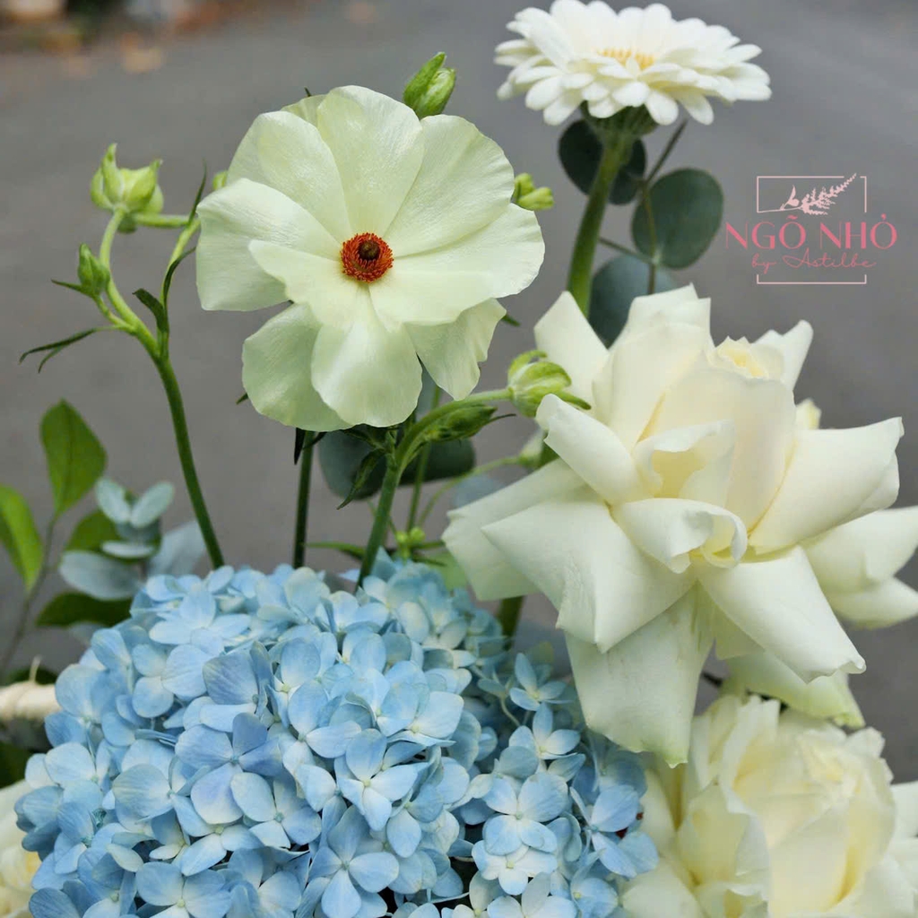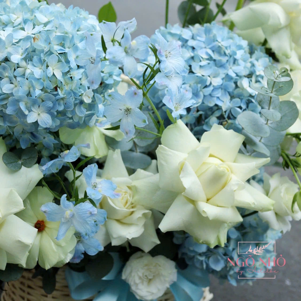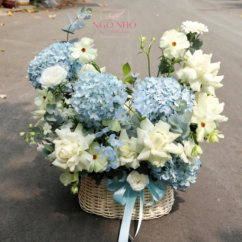 Hoa Nguyên Liệu: Giỏ hoa tú cầu xanh mix hồng trắng