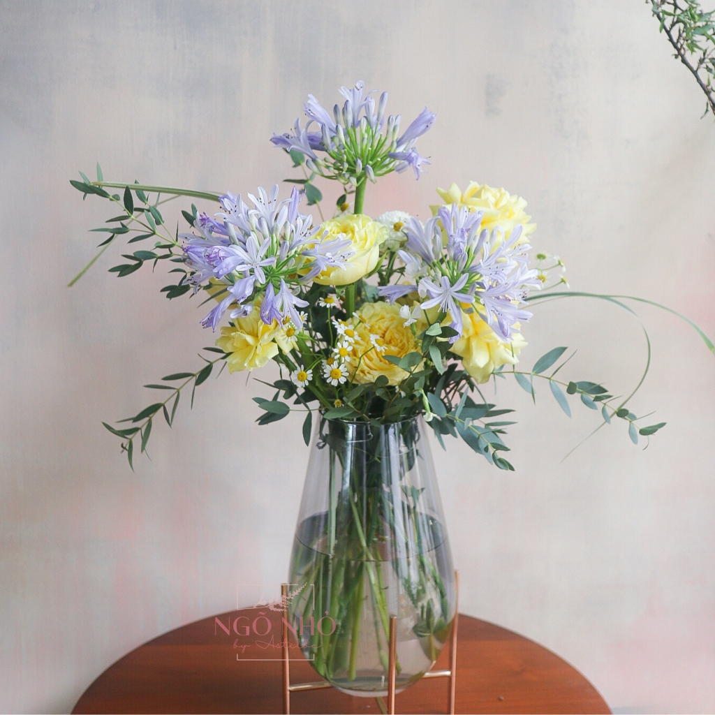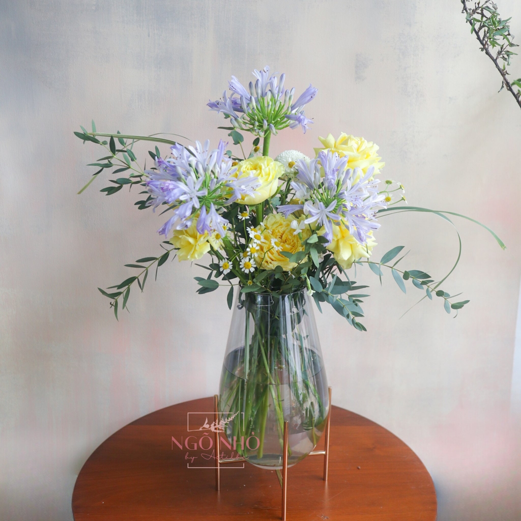 Thông Tin Bình Hoa: Bình thủy tinh trong suốt phong cách sang trọng, giúp tôn lên vẻ đẹp tự nhiên của hoa. Với bố cục bầu cùng bộ chân kê bình vàng gold.